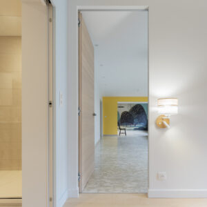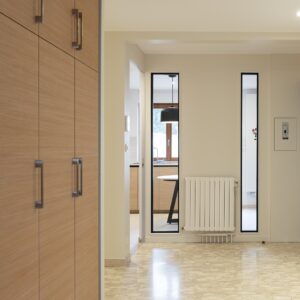 L’appartement d’une surface de 150m² a subit quelques aménagements mineurs. La vision première est un espace intérieur encore « dans son jus ». Fenêtres dépareillées, volets roulants mécaniques en bois, portes intérieures en bois exotique et quincaillerie « alu ton or ».