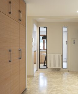 L’appartement d’une surface de 150m² a subit quelques aménagements mineurs. La vision première est un espace intérieur encore « dans son jus ». Fenêtres dépareillées, volets roulants mécaniques en bois, portes intérieures en bois exotique et quincaillerie « alu ton or ».